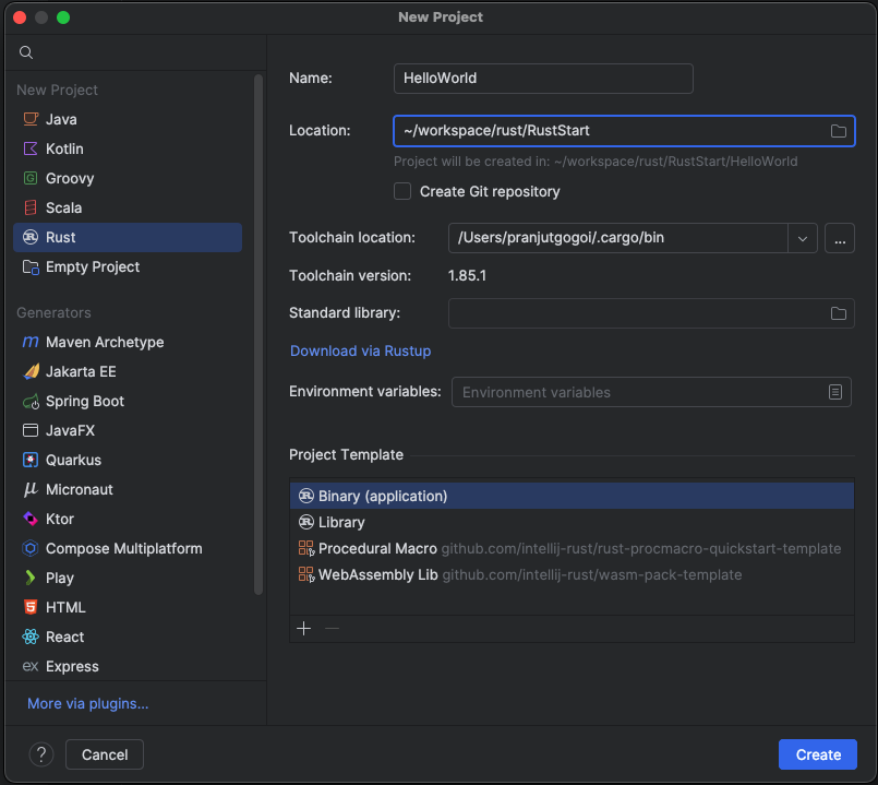 So, here we are, about to create our first Rust project in the IDE. In IntelliJ IDEA, the Rust plugin is already available, so we can simply create a new project and select Rust as the project type. For now, I’m going to create a simple Hello, World! project.