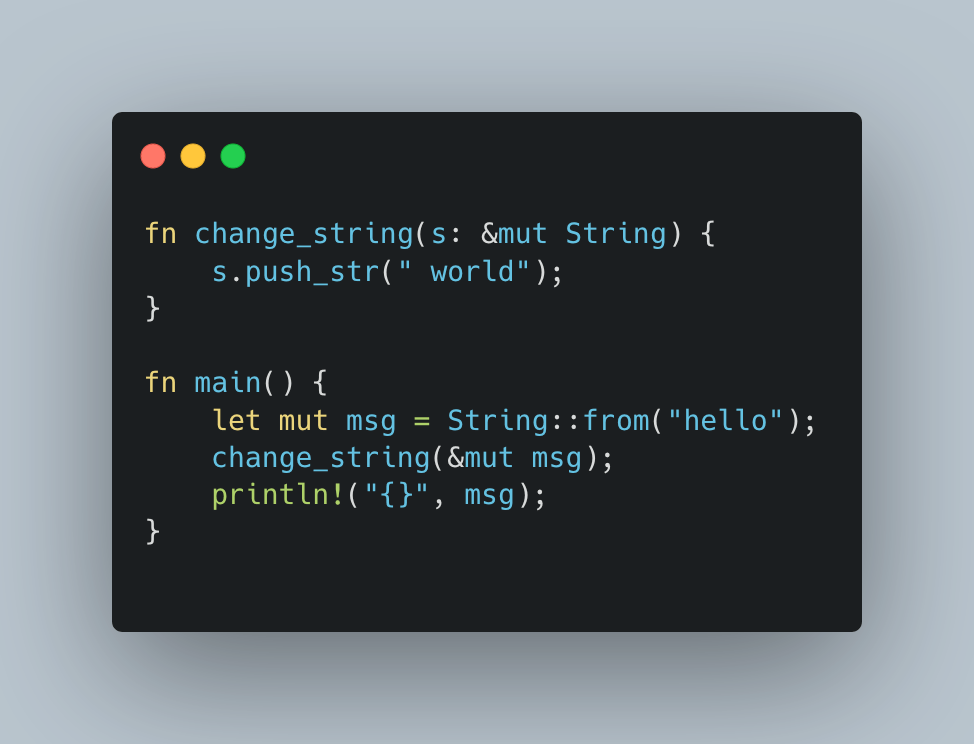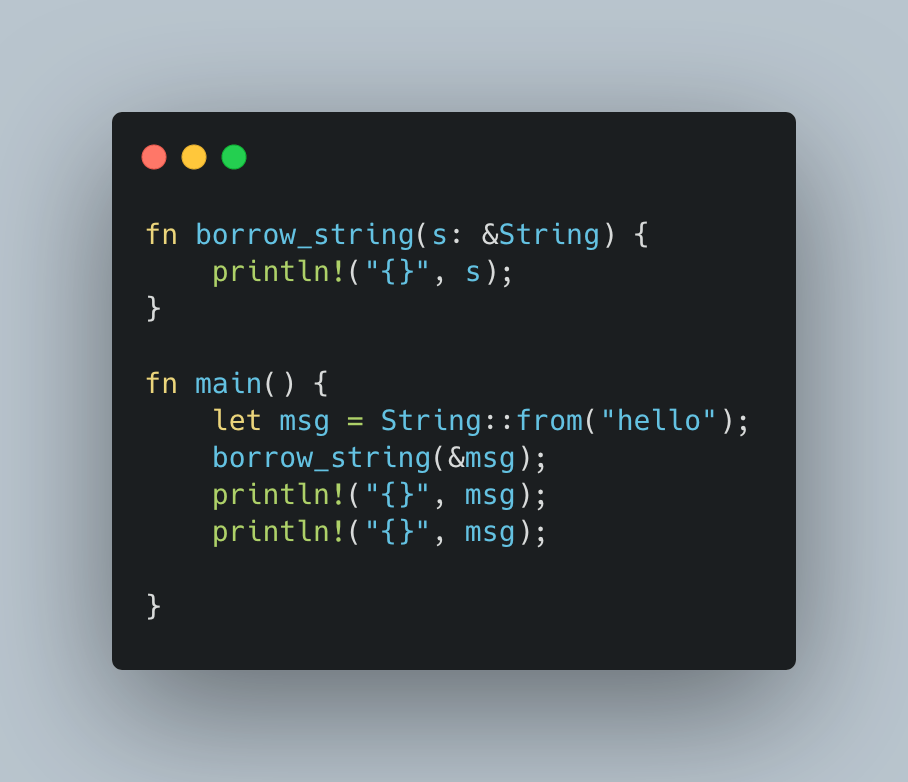 In the above example, borrow_string simply receives a reference to a variable and can use it to do its thing, while the original variable can still be used for further processing. Is there anything fishy? The ownership of msg didn’t get transferred to println!, right? Well, technically, println! isn’t a function—it’s a macro. This macro converts the code into std::io::_print(format_args!("Hello {}\n", name));. The important part is that the macro doesn’t evaluate immediately; it passes &name (a reference) instead, meaning ownership isn’t transferred.