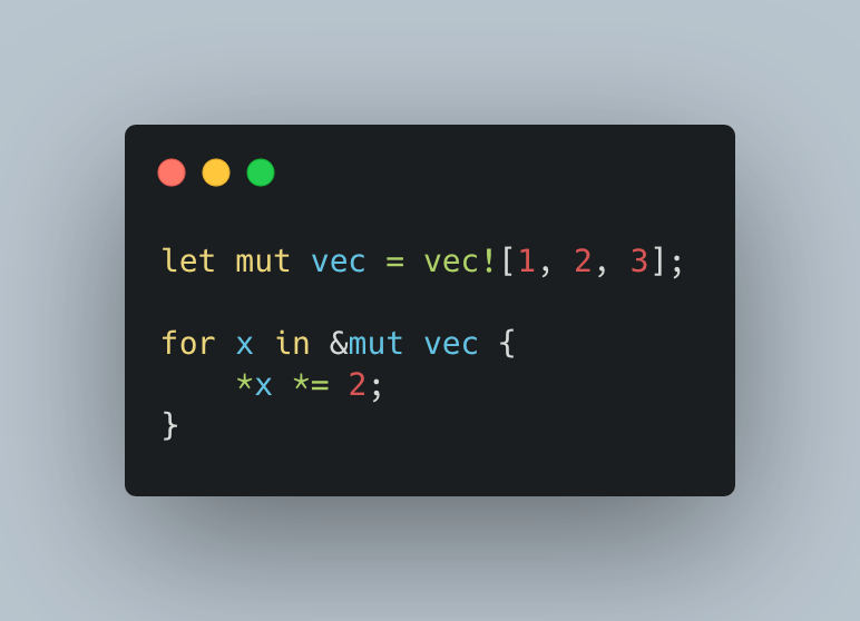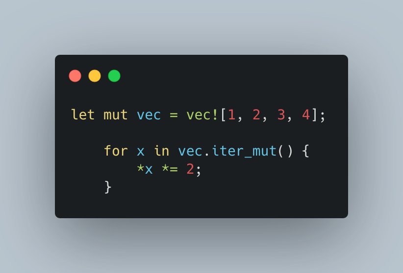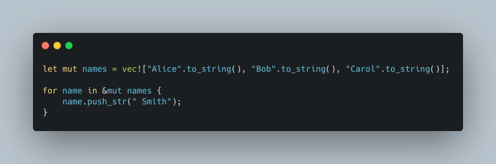 With this, you can mutate elements but can’t move or drop them. The Vec is borrowed mutably and remains usable after the loop. Use iter_mut() when you need to modify the elements of a collection in place.
